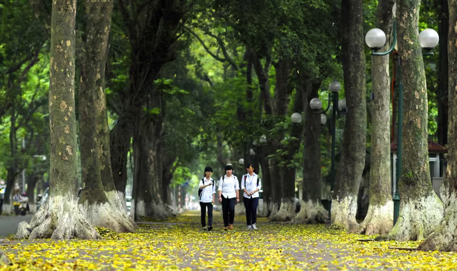 Nhưng thích nhất mỗi độ lá vàng rơi, trên hè phố Phan Đình Phùng lại rộn rã những bước chân thiếu nữ. Các cô gái Hà thành từ khắp các phố phường khác đổ về “phố lá vàng rơi” để lưu lại khoảnh khắc áo dài lướt trên thảm vàng, lưu lại những bàn chân đi nhẹ cánh tiên mà chợt vọng tới hình ảnh thú vị của “Con nai vàng ngơ ngác/ Đạp lên lá vàng thu”.