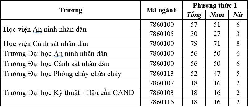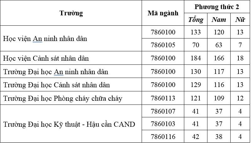 Phương thức 2: thi tuyển. Điều kiện dự tuyển là Thí sinh đăng ký dự tuyển nhóm ngành nghiệp vụ An ninh, nghiệp vụ Cảnh sát tại Học viện An ninh nhân dân, Học viện Cảnh sát nhân dân, Trường Đại học An ninh nhân dân, Trường Đại học Cảnh sát nhân dân, không quy định về lĩnh vực đào tạo, ngành đào tạo của thí sinh.