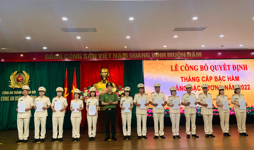 | Chỉ huy CAQ Hà Đông trao quyết định thăng cấp bậc hàm cho CBCS |