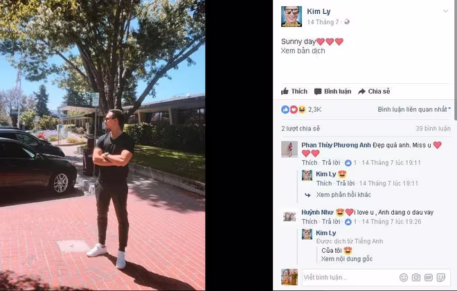 Trong khi đó, cũng vào sáng ngày 14-7, Kim Lý chia sẻ bức ảnh "selfie" với chú thích: "Sunny Day" (tạm dịch: Ngày nắng). Trả lời câu hỏi đang ở đâu từ một người bạn, Kim Lý cho biết anh đang ở SF Mark, thung lũng Napa. Được biết đây cũng chính là địa điểm mà du khách tìm đến để trải nghiệm cảm giác ngắm thành phố từ trên khinh khí cầu.