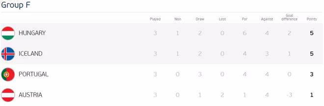 Tuy nhiên, ở trận đấu cùng giờ, vào phút bù giờ cuối cùng, Iceland đã có bàn thắng quý như vàng trước Áo để giành chiến thắng 2-1 cùng 5 điểm chung cuộc, qua đó lấy luôn vị trí thứ 2 ở bảng F của Bồ Đào Nha.