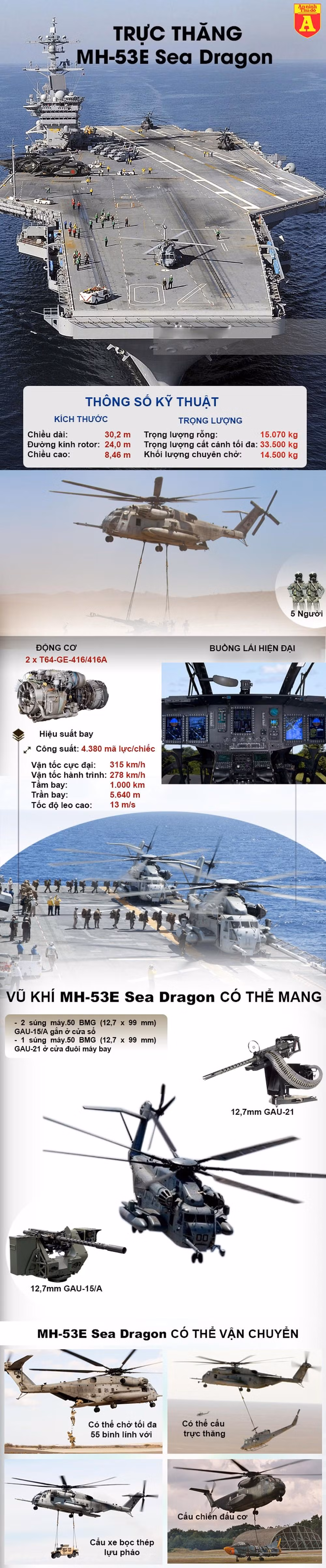 MH-53E Sea Dragon là trực thăng rà quét thủy lôi, phát triển từ nền tảng trực thăng vận tải hạng nặng CH-53E Super Stallion.Phiên bản này hiện đại hóa với động cơ mạnh và hệ thống điện tử tối tân có thể thực hiện đa nhiệm vụ từ vận chuyển hàng hóa, cứu thương, đổ quân thậm chí có thể biến thành trực thăng tấn công khi cần thiết. Với vai trò vận chuyển, MH-53E có thể vận chuyển một lượng lớn người bị thương sơ tán ra khỏi trận địa, hoặc tìm kiếm cứu nạn trong những chuyến bay dài. Mỗi chiếc có khối lượng rỗng 14,5 tấn và khối lượng cất cánh tối đa gần 33,5 tấn.