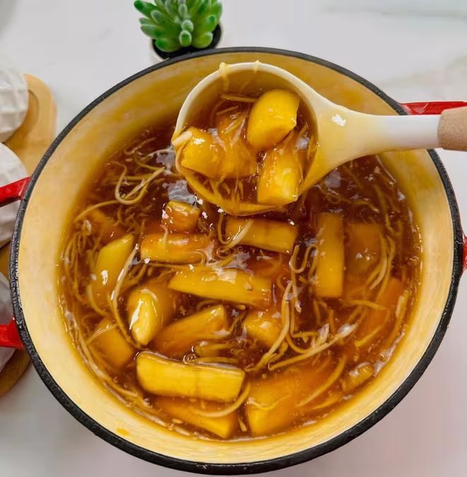 Thời gian qua món sắn hấp nước cốt dừa, lá nếp, bỗng là “hot trend” trên mạng xã hội. Đó là những củ sắn được luộc hoặc hấp cho chín tới, sau đó đổ bỏ nước luộc đi rồi thay nước mới, thêm đường, nước cốt dừa, dừa nạo, đặc biệt là nước lá nếp đã được xay lọc kỹ. Cứ thế mà rim trên lửa vừa nhỏ cho đến khi những miếng sắn nở bung, phần nước cốt thấm hết vào sắn là được. Những miếng sắn xanh màu lá non rất hấp dẫn, ăn vừa ngọt thơm, vừa bùi, vừa béo lại vừa dẻo