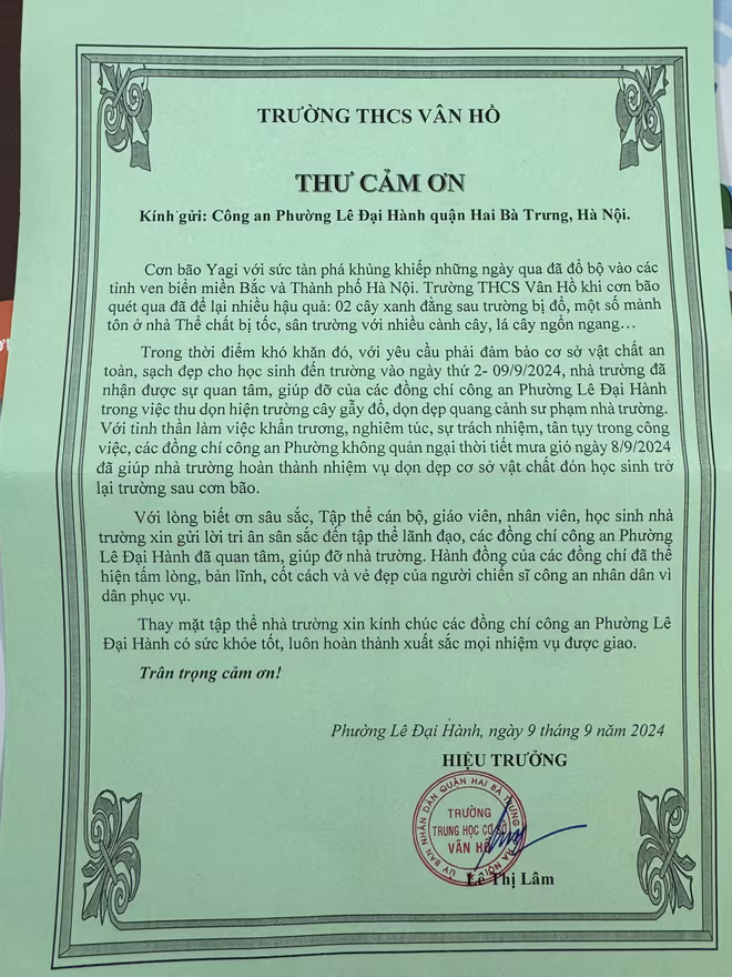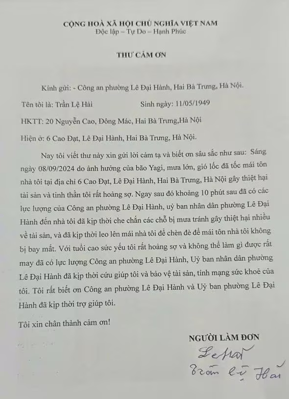 Và chưa hết, là lá thư cảm ơn của bà Trần Lệ Hải (trú tại số 6 phố Cao Đạt): “Sáng 8-9, mưa lớn, gió lốc đã tốc mái tôn nhà tôi, gây thiệt hại tài sản và tinh thần tôi rất hoảng sợ. Sau đó khoảng 10 phút đã có lực lượng Công an phường, ủy ban phường đến, kịp thời che chắn các chỗ bị mưa. Các anh còn trèo lên mái nhà để chèn, không để tấm tôn bay mất. Tôi rất biết ơn Công an phường và UBND phường đã kịp thời giúp đỡ tôi…”