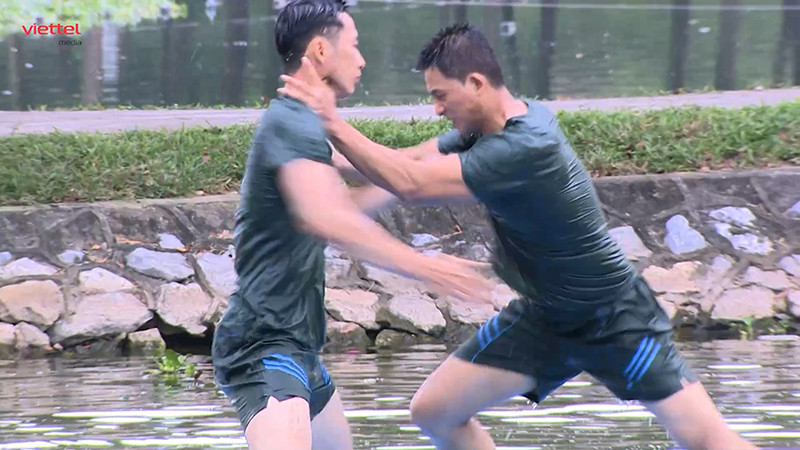 Đáng chú ý là phần thi của Nguyễn Việt Hoàng và Huỳnh Ngọc Lập. Nếu lúc luyện tập 2 chiến sĩ mới thể hiện sự ngang sức ngang tài thì ở phần thi đấu chính thức, Việt Hoàng nhanh chóng đẩy Huỳnh Lập ngã xuống nước.