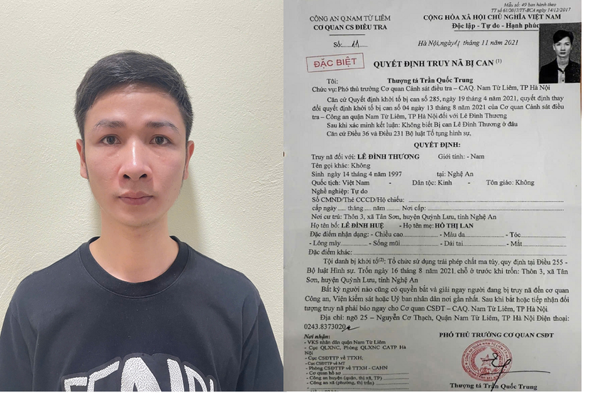 Theo hồ sơ, năm 2021, Lê Đình Thương bị Cơ quan Cảnh sát điều tra Công an quận Nam Từ Liêm ra lệnh truy nã đặc biệt về tội "Tổ chức sử dụng trái phép chất ma túy".