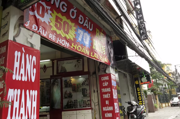 Những biển giảm giá gắn chi chít trên của hàng ở phố Tôn Đức Thắng