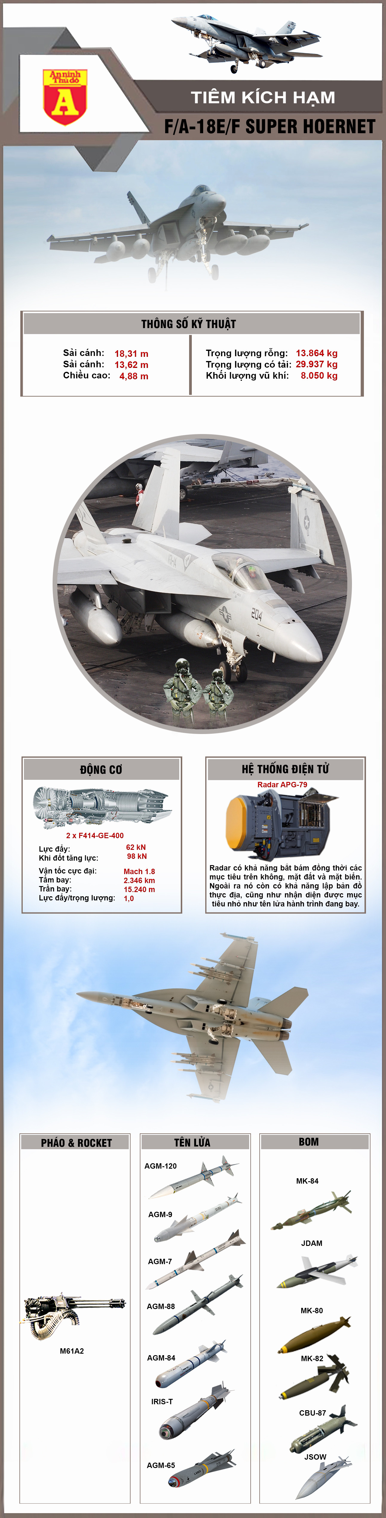 F/A-18E/F Super Hornet được phát triển từ tiêm kích hạm nổi tiếng F/A-18 Hornet. Chúng được đưa vào trang bị trong không quân hải quân Mỹ vào năm 1999 nhằm thay thế cho chiếc máy bay F-14 Tomcat. F/A-18 Super Hornet được tihết kế với hai phiên bản, phiên bản E một chỗ ngồi và F hai chỗ ngồi.