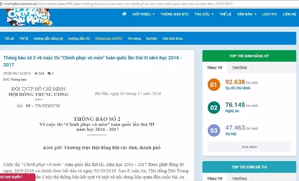 Ngày 5-12, Hội đồng đội Trung ương cũng ra thông báo nêu rõ, cuộc thi “Chinh phục vũ môn” toàn quốc lần thứ III, năm học 2016 - 2017 được phát động từ ngày 26/9/2016 và chính thức bắt đầu từ ngày 03/10/2016.