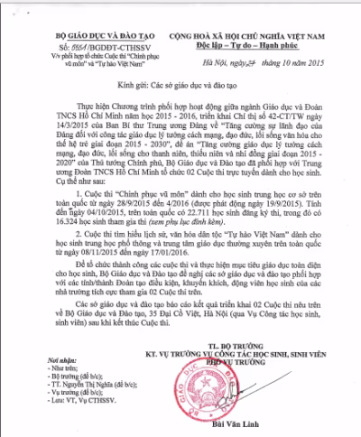 Công văn nêu rõ: Thực hiện Chương trình phối hợp hoạt động giữa ngành Giáo dục và Đoàn TNCS Hồ Chí Minh năm học 2015 - 2016, triển khai Chỉ thị số 42-CT/TW ngày 14/3/2015 của Ban Bí thư Trung ương Đảng về “Tăng cường sự lãnh đạo của Đảng đối với công tác giáo dục lý tưởng cách mạng, đạo đức, lối sống văn hóa cho thế hệ trẻ giai đoạn 2015 - 2030”, đề án “Tăng cường giáo dục lý tưởng cách mạng, đạo đức, lối sống cho thanh niên, thiếu niên và nhi đồng giai đoạn 2015 - 2020” của Thủ tướng Chính phủ, Bộ GD-ĐT đã phối hợp với Trung ương Đoàn TNCS Hồ Chí Minh tổ chức 2 Cuộc thi trực tuyến dành cho học sinh.
