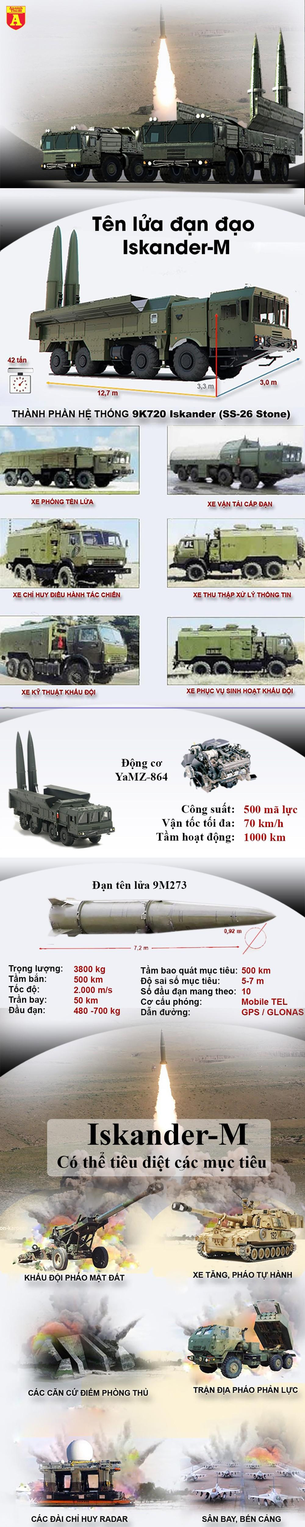 Iskander-M là tên lửa một tầng đẩy sử dụng nhiên liệu rắn, trang bị hệ thống dẫn đường vệ tinh. Loại tên lửa này có thể mang cả đầu đạn thông thường cũng như đầu đạn hạt nhân. Mỗi xe vận chuyển kiêm bệ phóng (TEL) có thể mang hai quả đạn với khả năng lựa chọn mục tiêu độc lập, tăng gấp đôi hỏa lực so với những tổ hợp cũ hơn như Tochka-U hay Oka.
