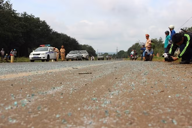 Tại hiện trường, cả hai xe bị hư hỏng nặng, kính xe vỡ nát vung vãi khắp nơi, hai xe nằm cách nhau khoảng 200 mét.
