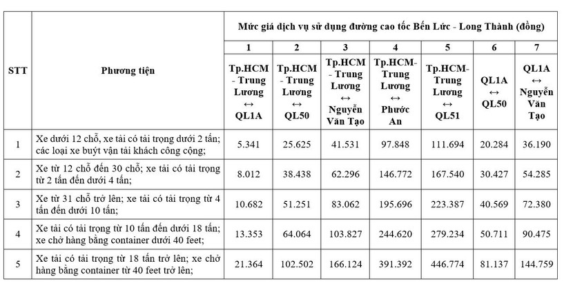 | Mức phí các loại xe trên cao tốc Bến Lức- Long Thành từ 10-8 |