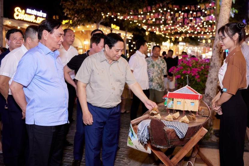 Thủ tướng đã trực tiếp ghé thăm một gian hàng trưng bày các sản phẩm thủ công mỹ nghệ do người dân bản địa trực tiếp chế tác, mô tả những hoạt động thường nhật của ngư dân đảo Ngọc nhằm lan tỏa văn hóa truyền thống. Ảnh Minh Khánh