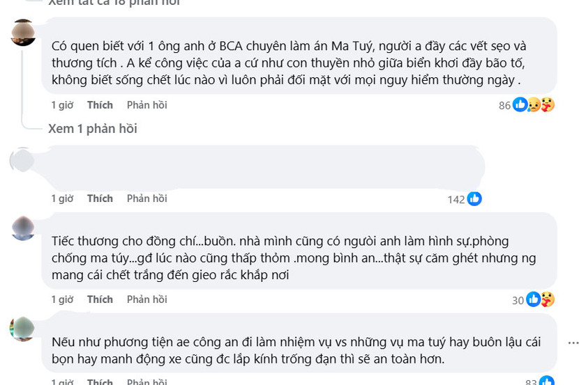 Chia sẻ trên mạng xã hội, tài khoản Anh Vu Tuan nhận định, lực lượng Cảnh sát ma túy rất nguy hiểm: “Có quen biết với 1 ông anh ở BCA chuyên làm án ma tuý, người anh đầy các vết sẹo và thương tích. Anh kể công việc của anh cứ như con thuyền nhỏ giữa biển khơi đầy bão tố, không biết sống chết lúc nào vì luôn phải đối mặt với mọi nguy hiểm thường ngày".