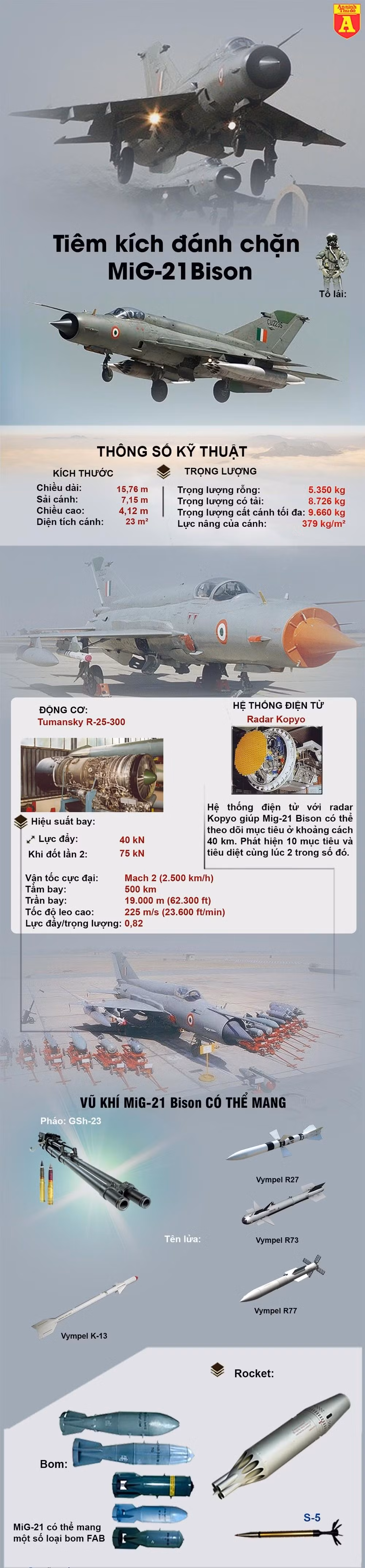 Tiêm kích đa dụng một động cơ MiG-21 được Ấn Độ mua từ Liên Xô, từng giữ vai trò xương sống đối với sức mạnh không quân quốc gia. Tiêm kích do Liên Xô phát triển từ những năm 1950, với gần 11.500 chiếc được sản xuất.