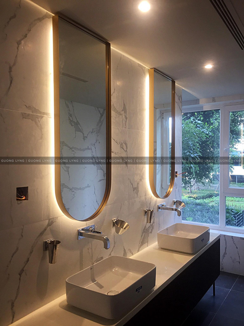 Đây là những mẫu gương đèn LED được chế tạo riêng theo yêu cầu của gia chủ. Không chỉ thể hiện cá tính riêng, gương đèn LED còn được kết hợp với công tắc cảm ứng tiện lợi và hệ thống đèn hắt tuyệt đẹp.