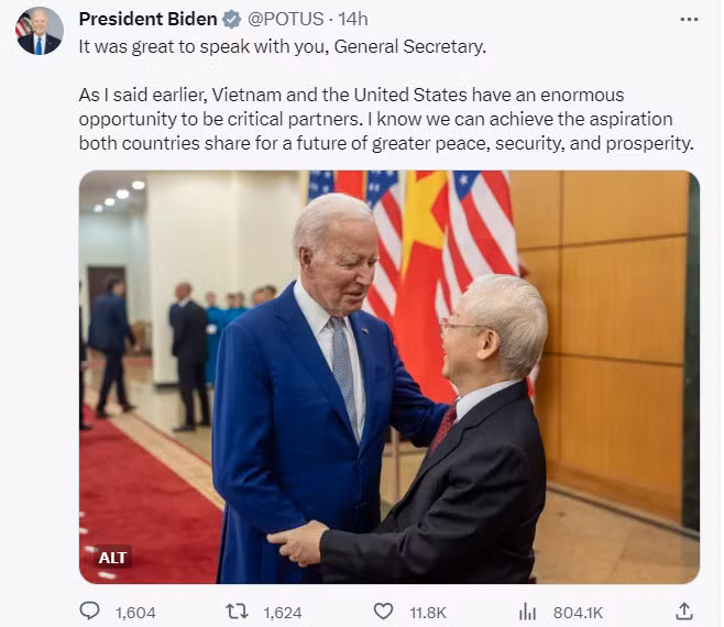 Tài khoản trên mạng X của nhà lãnh đạo Mỹ cũng trân trọng đăng bức ảnh Tổng thống Joe Biden và Tổng Bí thư Nguyễn Phú Trọng bắt tay, trò chuyện cùng nhau cùng dòng cảm xúc: “Thật tuyệt vời khi được trò chuyện với ngài Tổng Bí thư".