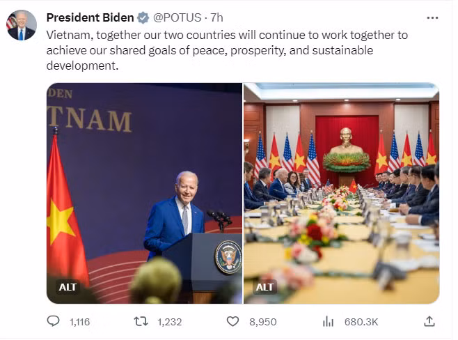 Trước đó, sau khi kết thúc ngày đầu tiên trong chuyến thăm Việt Nam hôm 10-9, Tổng thống Mỹ Joe Biden viết trên mạng xã hội X: “Cảm ơn các bạn vì sự chào đón nồng ấm. Tôi biết rằng đây sẽ là một chuyến thăm lịch sử”.