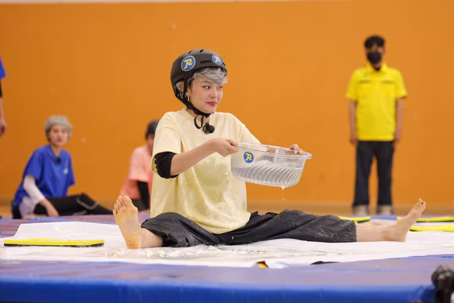 Các thành viên bịt mắt, đứng lên – ngồi xuống theo tín hiệu, và chỉ cần sai nhịp là “ăn” quả bóng nước mực từ trên trời rơi xuống. Quang Trung lãnh trọn cú ném trời giáng từ Trấn Thành đến mức “xuất hồn”. Lan Ngọc là trường hợp hy hữu “ngồi im cũng trúng đạn”: lúc Quân A.P thua thì ướt nhẹ, nhưng khi Minh Hằng sai nhịp, Lan Ngọc hứng trọn trận mưa mực.