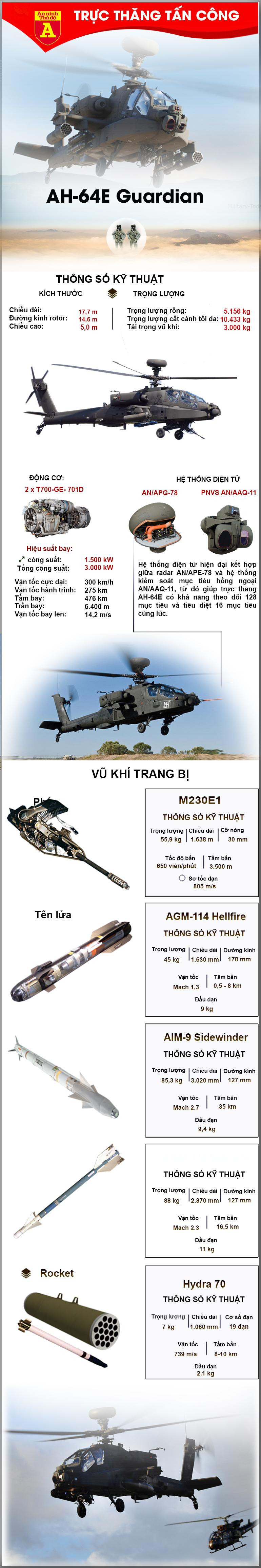 AH-64E Guardian hiện là phiên bản mạnh nhất hiện nay trong gia đình trực thăng tấn công Apache. So với những phiên bản trước, AH-64E được nâng cấp cả về hệ thống động cơ, điện tử và vũ khí, chúng sẽ đóng vai trò trực thăng tấn công mạnh nhất thế giới hiện nay.