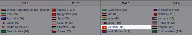 Với hạng 103 thế giới, tuyển Việt Nam nằm trong nhóm hạt giống thứ 3 Asian Cup 2019