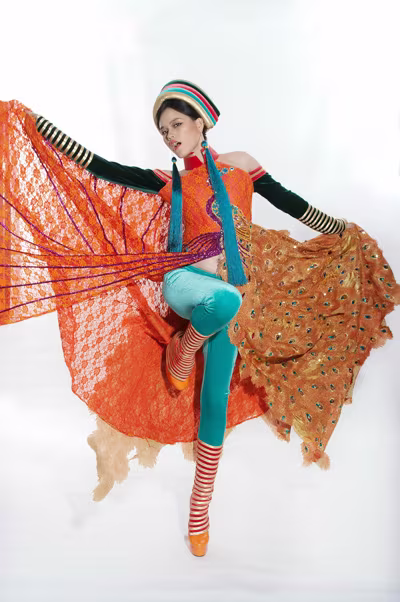 Chiếc áo do NTK Võ Việt Chung làm từ chất liệu ren kết hợp nhung với màu sắc rực rỡ chủ đạo như cam, xanh cổ vịt, nhũ vàng… và lấy biểu tượng con chim trĩ, một loài chim mạnh mẽ và thông minh được sử dụng để trang trí trong nhà hay những lễ hội truyền thống của dân tộc Dao để tạo dáng và thêu từng chiếc lông chim trĩ hay kết hợp cùng các loại đá quý lên thân áo và đuôi áo tạo nên một bức tranh văn hoá rực rỡ đa sắc màu của bản làng dân tộc Dao.