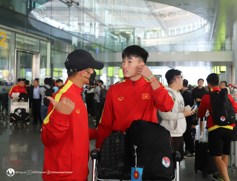 | Khuất Văn Khang (phải) và đồng đội U20 Việt Nam đã về tới Hà Nội (Ảnh: VFF) |