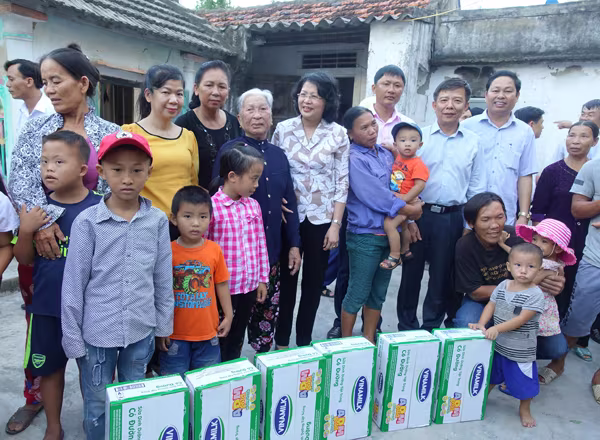Bà Đặng Thị Ngọc Thịnh – Phó Chủ tịch nước, ông Đậu Phi Tú – Giám đốc trang trại Vinamilk Hà Tĩnh và đại diện lãnh đạo tỉnh Hà Tĩnh đến thăm và tặng quà, sữa cho người dân và trẻ em vùng lũ xã Kỳ Lạc, huyện Kỳ Anh, Hà Tĩnh