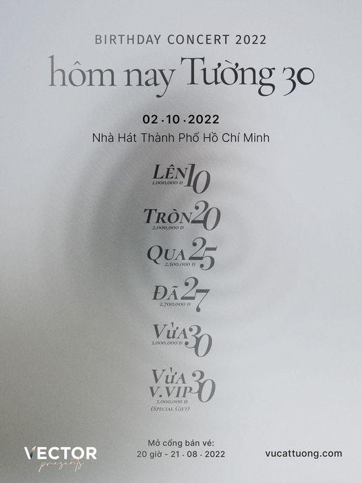 Mới đây ca sĩ, nhạc sĩ Vũ Cát Tường thông báo sẽ tổ chức đêm nhạc "Birthday Concert: Hôm nay Tường 30" vào đúng ngày sinh nhật của mình, cụ thể là tối 2-10-2022 tại Nhà hát TP.HCM.
