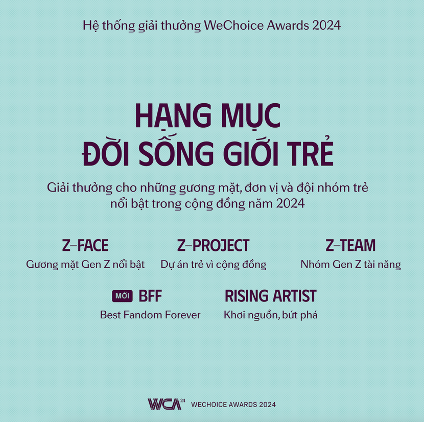 Hệ thống giải thưởng của WeChoice Awards 2024 bao gồm: Hạng mục Nhân vật truyền cảm hứng, Hạng mục Giải trí, Hạng mục GenZ Area, Hạng mục Trái tim dung cảm, Hạng mục Dự án vì Việt Nam tôi. Trong đó, đáng chú ý là sự xuất hiện của “tân binh” đáng gờm BFF – Best Fandom Forever. Đây là cái tên mới toanh thuộc hạng mục GenZ Area. Sự xuất hiện của BFF cho thấy một năm với nhiều đỉnh cao và sự bứt phá của giải trí Việt nói chung, cũng như phản ánh văn hoá hâm mộ thần tượng Việt nói riêng của giới trẻ đã diễn ra mạnh mẽ và sôi động cỡ nào.