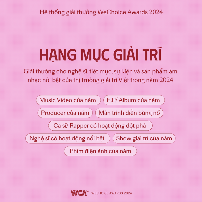 Hạng mục Giải trí của WeChoice Awards 2024 bao gồm: Ca sĩ/ Rapper có hoạt động đột phá. E.P/ Album của năm, Màn trình diễn bùng nổ, Music Video của năm, Nghệ sĩ có hoạt động nổi bật, Phim điện ảnh của năm, Producer của năm.