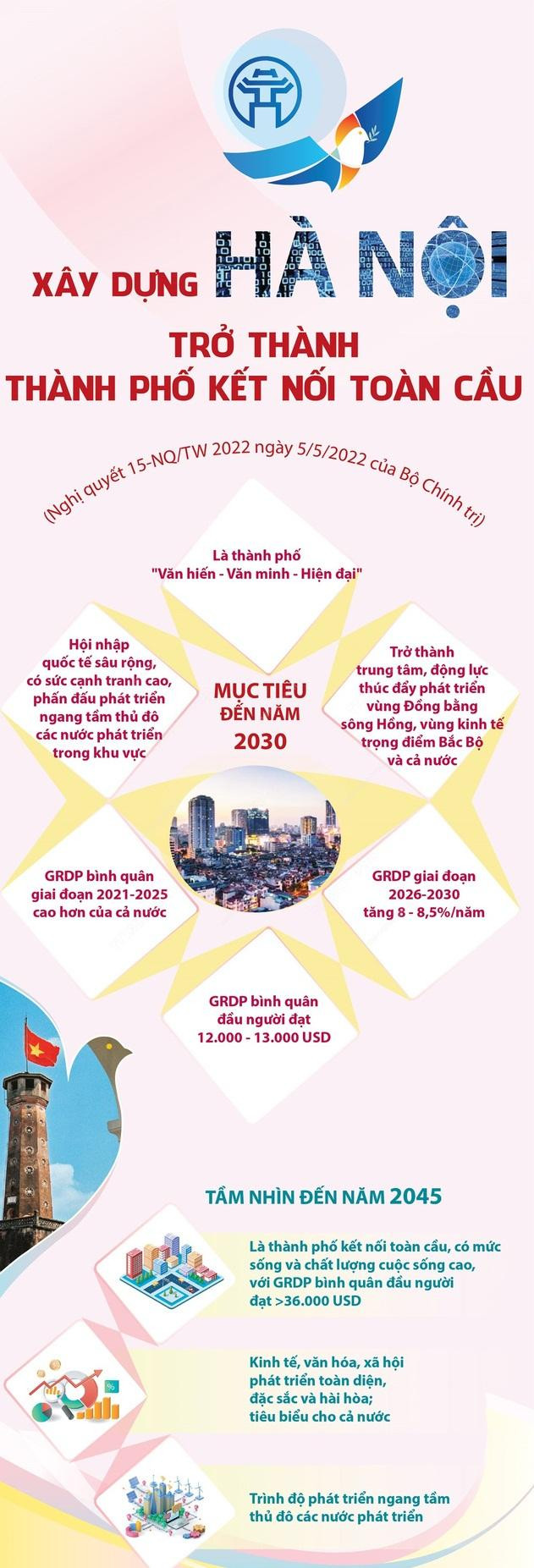 - Đến năm 2045, Thủ đô Hà Nội là thành phố kết nối toàn cầu, có mức sống và chất lượng cuộc sống cao, với GRDP/người đạt trên 36.000 USD; kinh tế, văn hóa, xã hội phát triển toàn diện, đặc sắc và hài hòa; tiêu biểu cho cả nước; có trình độ phát triển ngang tầm Thủ đô các nước phát triển trong khu vực và trên thế giới.