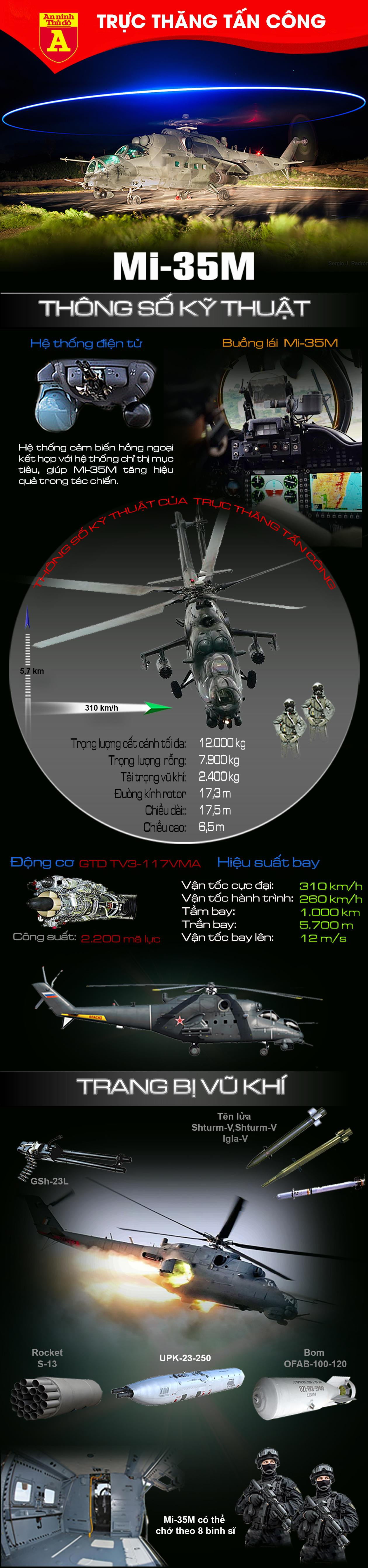 "Xe tăng bay" Mi-35M là dòng trực thăng chiến đấu đa năng mới nhất do Công ty Rostvertol/Nga nghiên cứu và phát triển dựa trên dòng máy bay trực thăng chiến đấu đa năng hạng nặng Mi-24 Hind. NATO gọi Mi-35M là Hind E, còn các phi công Nga gọi loại máy bay này là “Xe tăng bay”. Đây là dòng trực thăng tấn công hiện đại của Nga, mới được đưa vào biên chế với số lượng khoảng hơn 50 chiếc.