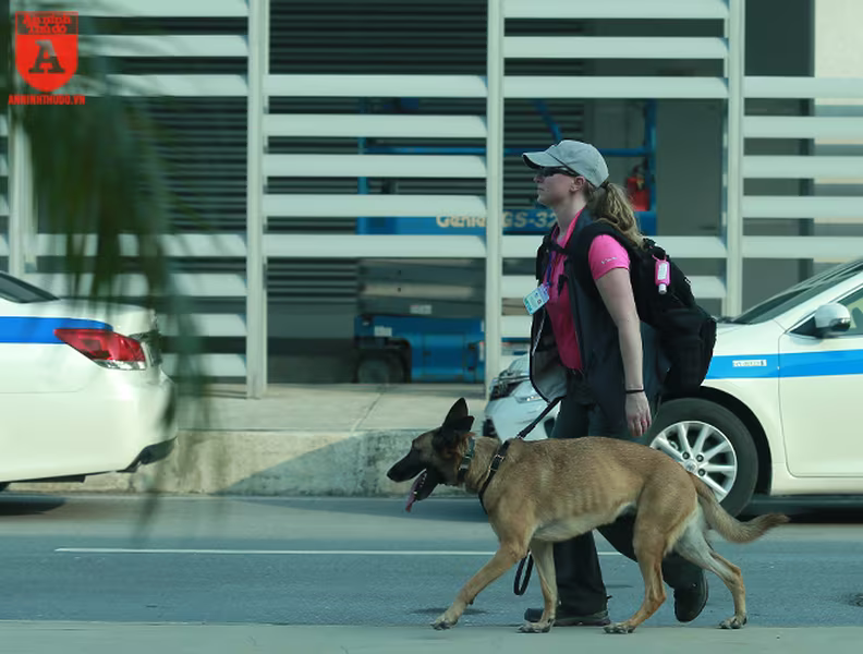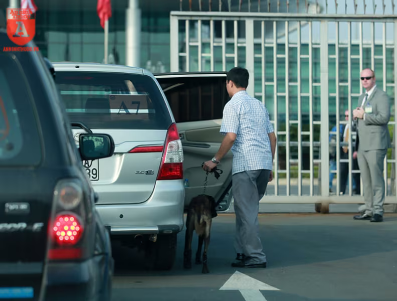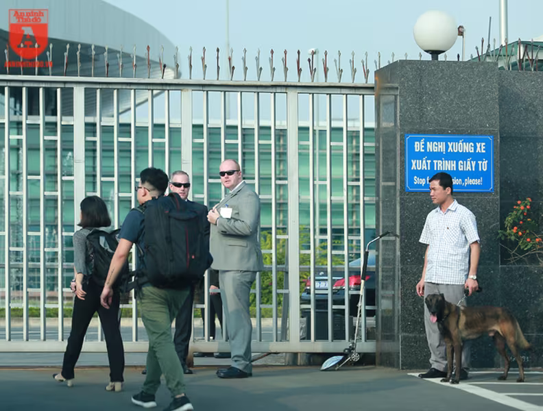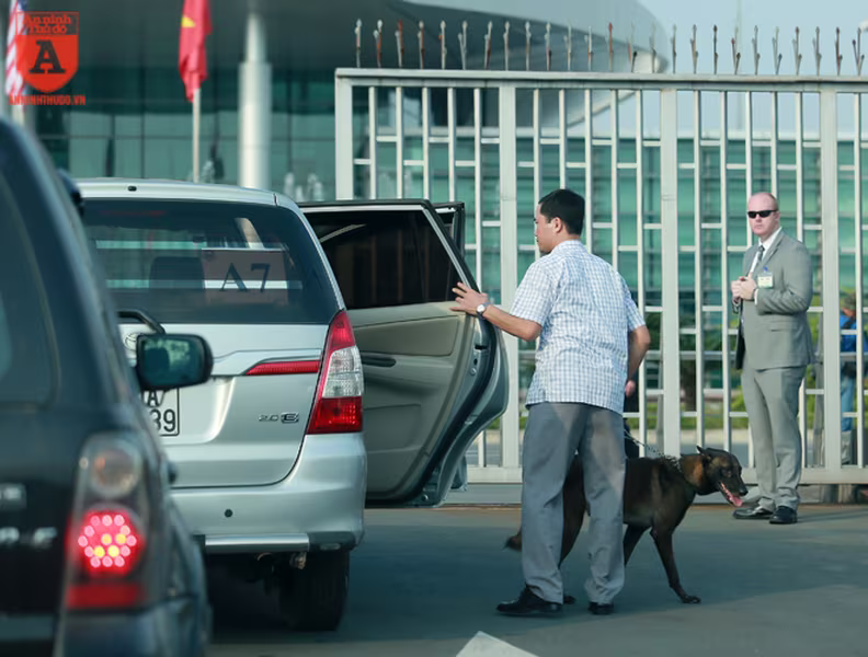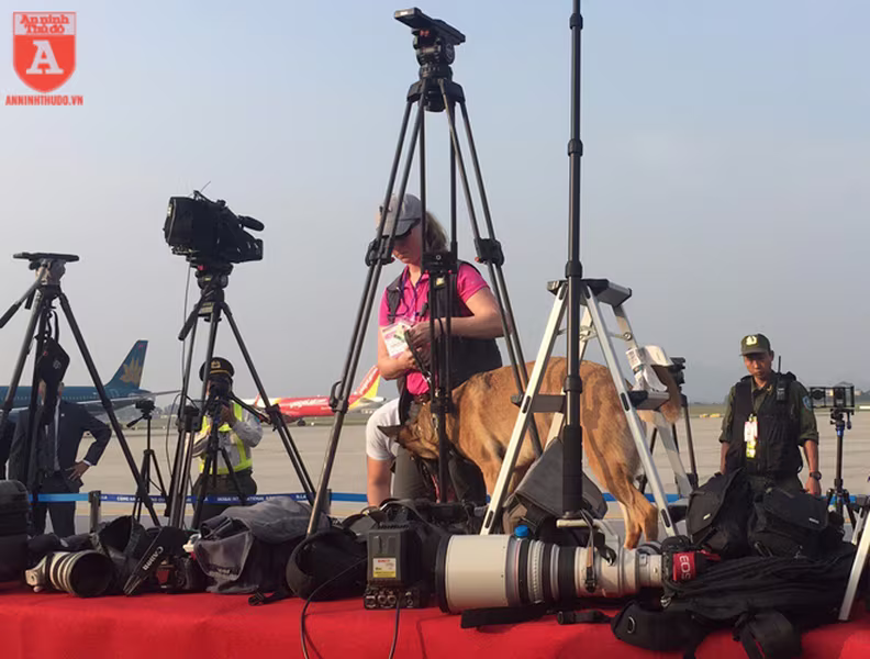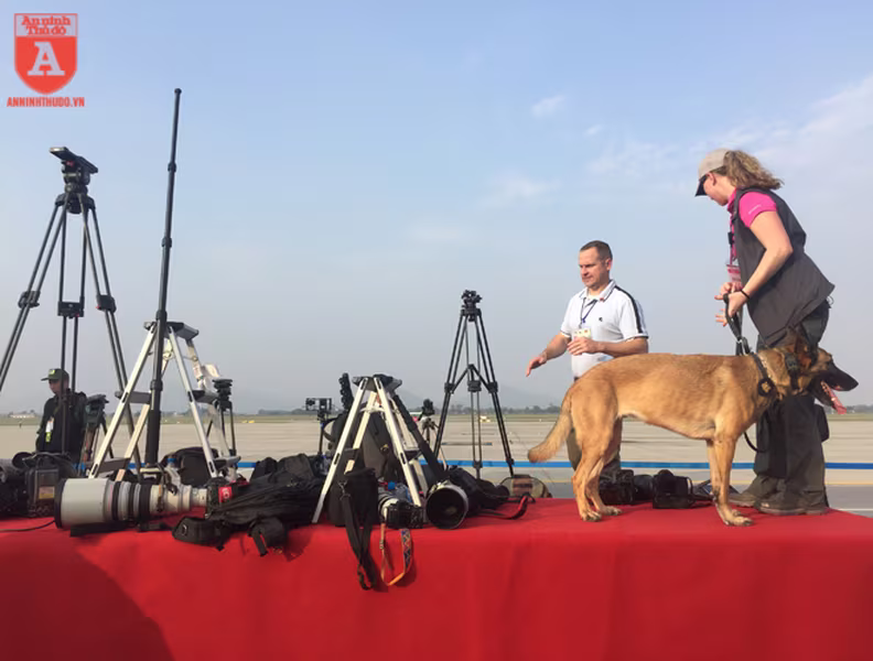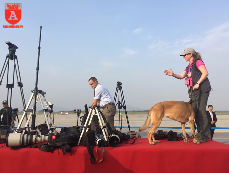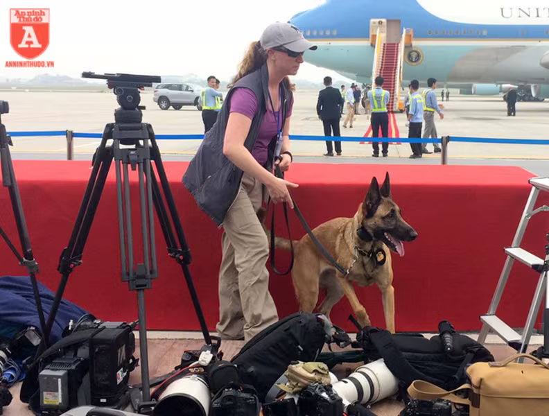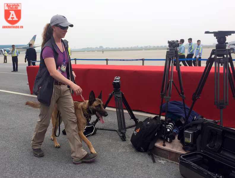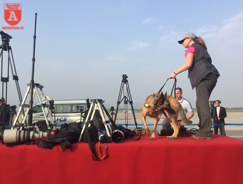ANTD.VN -Để đảm bảo an ninh trước khi chuyên cơ của Tổng thống Mỹ Donald Trump hạ cánh xuống sân bay Nội Bài, từ ngoài cổng cho đến khu vực dẫn vào đường băng đều được mật vụ Mỹ sử dụng những chú chó nghiệp vụ (cảnh khuyển) đánh hơi rà soát kỹ lưỡng, nhằm phát hiện những mối nguy hiểm mà thiết bị điện tử không thể phát hiện.