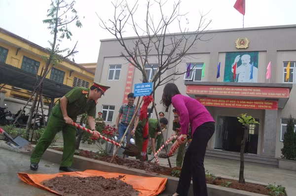 Đại tá Nguyễn Hồng Thái, Trưởng CAQ Hoàng Mai cùng đại diện lãnh đạo Đảng ủy, HĐND, UBND phường Trần Phú trồng cây lưu niệm tại CAP Trần Phú nhân dịp kỷ niệm 70 năm Ngày truyền thống của lực lượng CSQLHC về TTXH